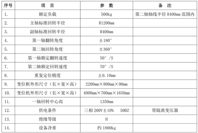該三軸垂直翻轉伺服變位機主要由焊接整體機架、翻轉變位框、交流伺服電機及RV 精密減速機、回轉支撐、導電機構、防護護罩及電氣控制系統等構成。