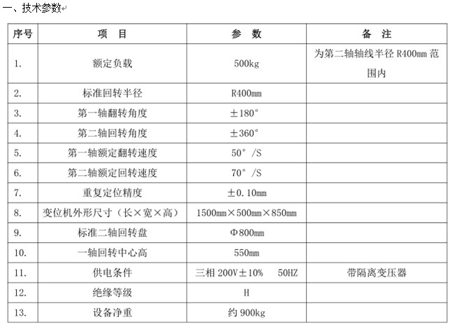 該雙軸伺服變位機主要由焊接整體機架、回轉平臺、交流伺服電機及 RV 精密減速機、回轉支撐、導電機構、防護護罩及電氣控制系統等構成。